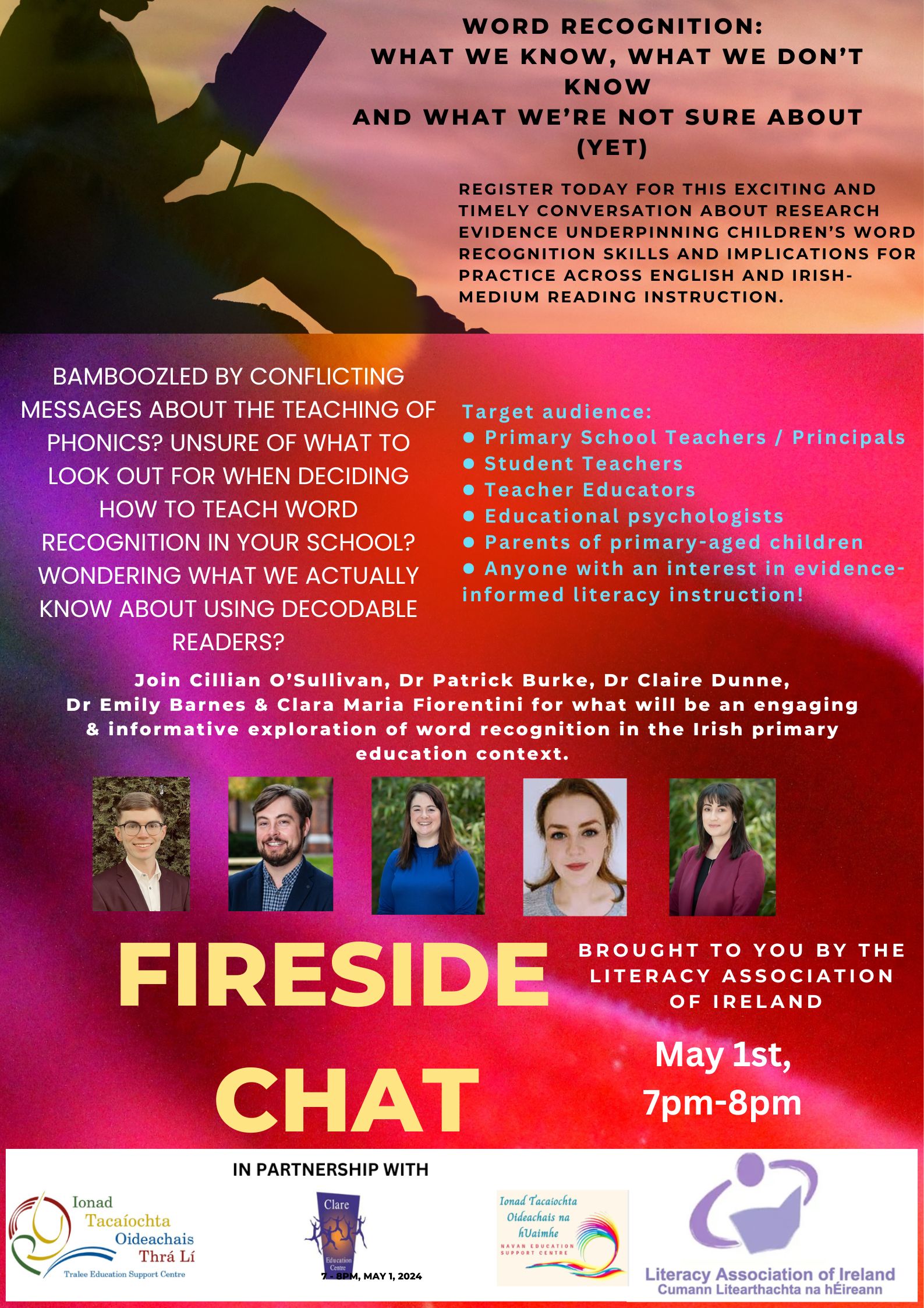 Join Dr Patrick Burke, Cillian O’Sullivan, Dr Claire Dunne, Dr Emily Barnes and Clara Maria Fiorentini for what will be an engaging and informative exploration of word recognition in the Irish primary education context.