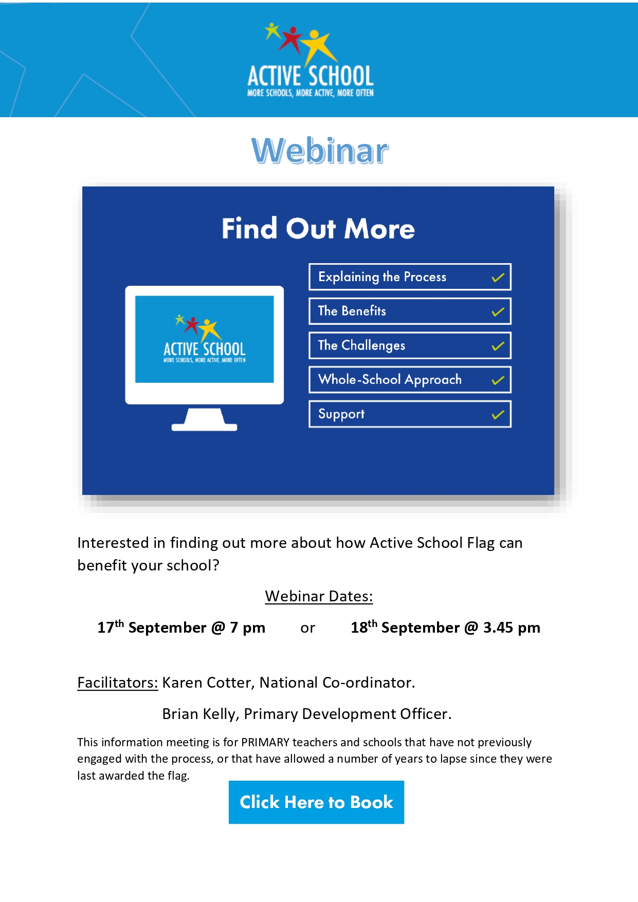 The Active School Flag Programme is a Department of Education 'Physical Activity for Wellbeing' Initiative in partnership with the Education Support Centres of Ireland and Healthy Ireland. The Programme seeks to embed a culture of physical activity in schools using fun and innovative strategies, and drawing on the unique settings and cultures of the participating schools. The evidence shows that the benefits of participating in this programme for whole school communities extend far beyond the physical into mental health, school morale - both for staff and students-, student voice, student leadership, behaviour, punctuality and attendance.