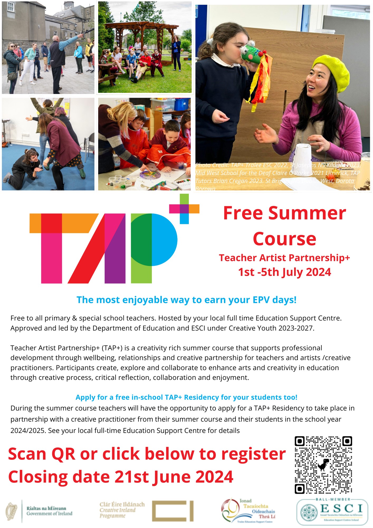 During the summer course teachers will have the opportunity to apply for a TAP+ Residency to take place in partnership with a creative practitioner from their summer course and their students in the school year 2024/2025. Tralee Education Support Centre will have 8 Residencies for participating teachers on the TAP+ Summer Course.
